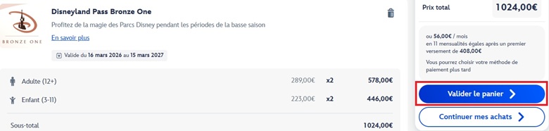 - Configuración del grupo: Indica el número de adultos (12+ años) y niños (3-11 años). Recuerda que en 2026 los precios son diferentes según la edad. Los menores de 3 años no necesitan pase (entran gratis). Haz clic en "Ajouter au panier" y revisa tu carrito en "Valider le panier".