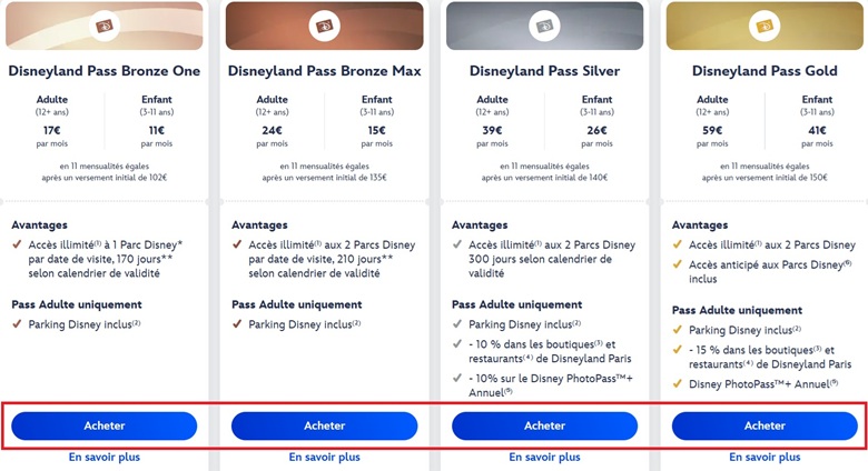 Desde el 12 de febrero de 2026, en Disneyland Paris existen cuatro tipos de Disneyland Pass: Bronze One, Bronze Max, Silver y Gold. El cambio principal es el desdoblamiento de la categoría Bronze, que ahora permite elegir entre un precio más ajustado (Bronze One) o una mayor flexibilidad (Bronze Max).
