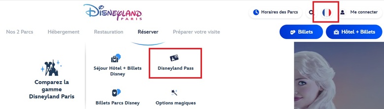 - Sección de Pases: En el menú superior, pulsa en "Réserver" y luego selecciona "Disneyland Pass".